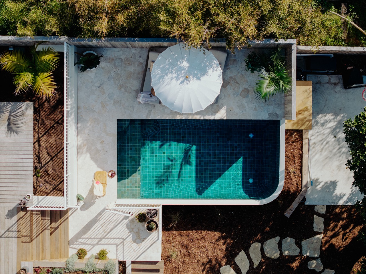 In this project we transformed an empty space into a private resort style retreat. The travertine crazy paving gives it a timeless organic feel with a touch of the mediterranean. The pool is custom design and built by us using shock crete process and is fully tiled with Sukabumi tiles from Bali. To insure the pool fencing had style we installed a beautiful custom designed powder coated fence with safety gate. The boundary fence is built from Lawson adding privacy.